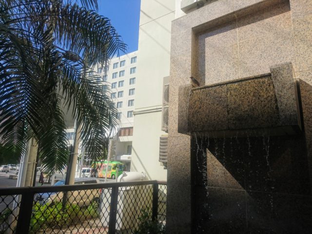 ホテルのテラスで鳥が水浴びしています。冬の景色には見えません。