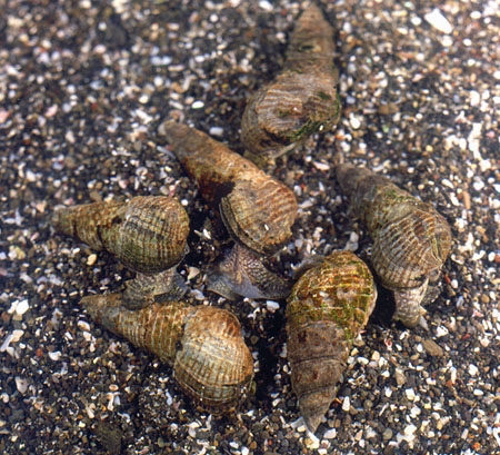 潮だまりの岩やリーフ、人工海岸でも岸壁にくっついている《ウミニナ科》の巻貝の仲間。ウミニナの仲間は全国各地に生息しています。