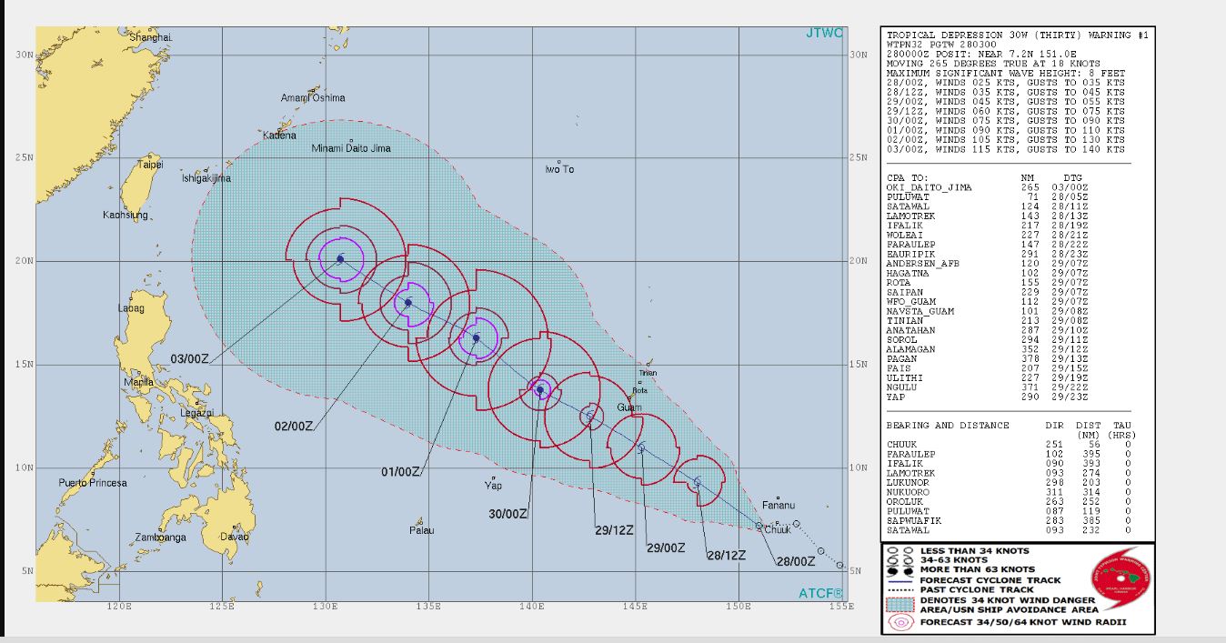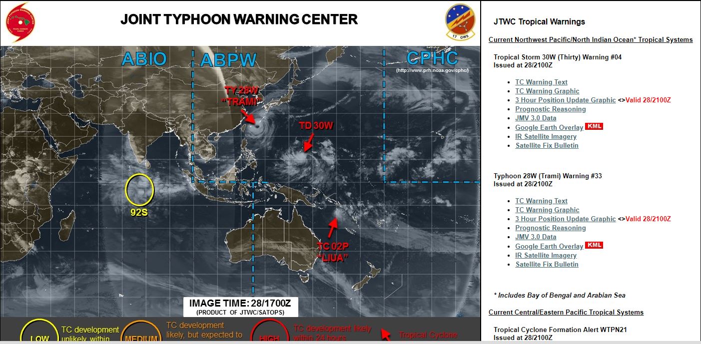 ・画面右側の【Tropical Storm 30W (Thirty) Warning】が今後台風25号になる可能性のある熱帯低気圧の情報。【Typhoon 28W (Trami) Warning #33】が現在猛威を振るっている台風24号の情報です。