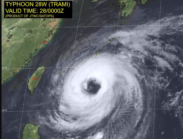 ・画面右側の【Tropical Storm 30W (Thirty) Warning】が今後台風25号になる可能性のある熱帯低気圧の情報。【Typhoon 28W (Trami) Warning #33】が現在猛威を振るっている台風24号の情報です。