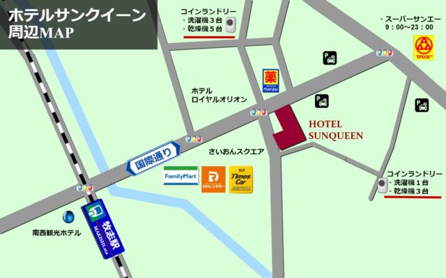 当館より徒歩約1〜2分程度の距離にコインランドリーがございます。フロントにて場所のご案内もしておりますのでお気軽にお声掛けください。