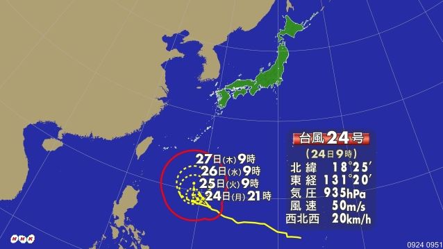沖縄方面へ接近中の台風24号。 各国の予報機関の予想進路が概ね一致してきました。沖縄の南で停滞するかも!?との 予報もあり予断を許さない状況です。 【9/24 18:00更新】最初の予報より近寄ってるじゃないか!やめろよ…